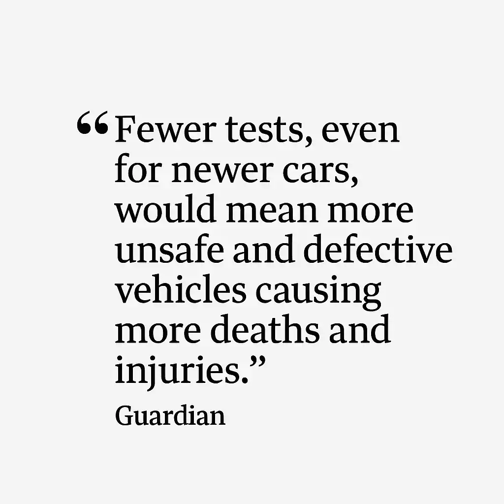 “The danger – quite apart from the increased burden of extra repair and insurance costs – is that fewer tests, even for newer cars, would mean more unsafe and defective vehicles causing more deaths and injuries.”
